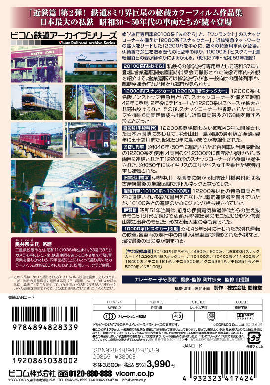 鉄道8ミリ界の巨星・奥井宗夫氏が昭和30年代~50年代に撮影したカラーフィルムによって、日本の懐かしい鉄道風景が鮮やかによみがえるシリーズの近鉄篇第2弾。昭和37年に私鉄初の修学旅行専用車でオール2階建ての20100系「あおぞら」が登場。貴重な試乗会の映像をはじめ、団体列車や臨時列車で活躍する姿を多数収録する。特急用車両として「スナックカー」12000系や、阪伊・名伊特急用「新スナックカー」12200系が登場。「新ビスタカー」10100系などと混結されるなど様々な運用を見せる。開業間もない鳥羽線や架け替え前の雲出川橋梁など単線区間の走行シーンも見逃せない。近鉄きってのローカル線で、昭和51年当時も伊賀電気鉄道時代からの生え抜きモニ5181形が活躍した伊賀線では、モ5000・ク5100形へ世代交代。伝説の初代「ビスタカー」10000系も昭和46年のお別れ運転を最後に引退する。(昭和37年~昭和59年撮影)